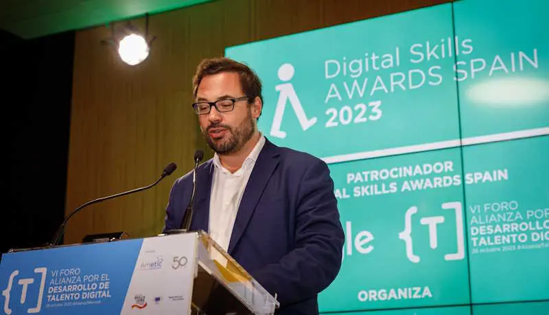 Ioannis Virvilis, jefe de prensa y portavoz de la Comisión Europea en España, ha sido el maestro de ceremonias en la entrega de los galardones, en la que ha intervenido Clara Sanz, secretaria general de Formación Profesional del Ministerio de Educación y Formación Profesional; Miguel Escassi, Head of Government Affairs and Public Policy de Google España y Portugal; y Elena Díaz-Alejo, presidenta de la Comisión de Desarrollo de Talento Digital de AMETIC y Manager Corporate Comms & Public Affairs de SAMSUNG.
