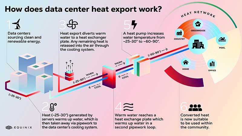 La iniciativa Heat Export de Equinix recupera el calor residual de sus data centers IBX y lo exporta a edificios de las comunidades circundantes, proporcionando una alternativa más limpia a los métodos tradicionales en un momento de subida de los precios mundiales de la energía y limitaciones del suministro. La compañía ha implementado numerosas iniciativas Heat Export alrededor de Europa y América, con programas en Francia, Finlandia, Alemania, Irlanda, Suiza y Canadá.